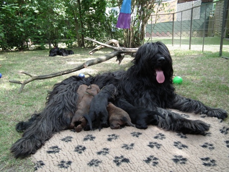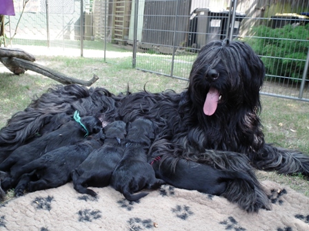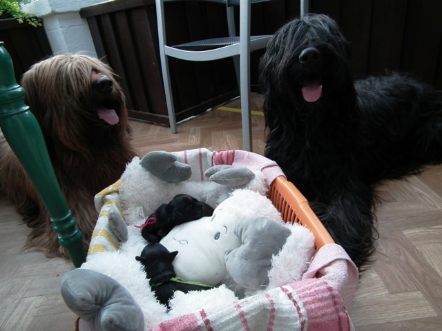 Aragorn hat bereits zahlreiche, erfolgreiche Nachkommen im In- und Ausland und Givenchy bekam im CfH die volle Zuchtzulassung mit einer sehr schönen Standardbeurteilung, so dass wir uns aus dieser Verpaarung typvolle, gesunde und wesensfeste Briards in den Farben fauve und noire versprechen.