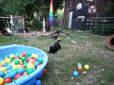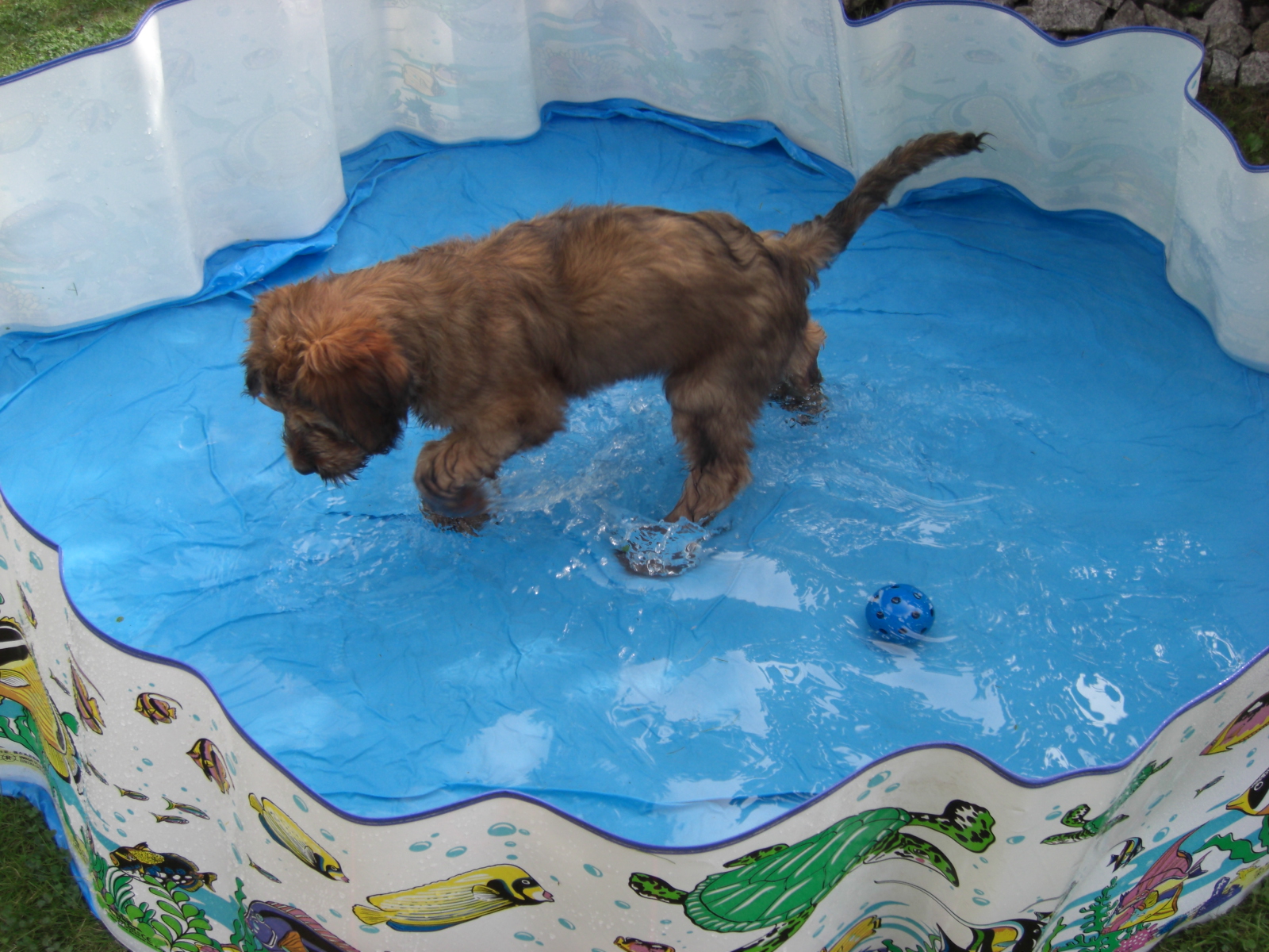 Planschbecken zerstört, tobt mit Hundekumpels durch Stadt,